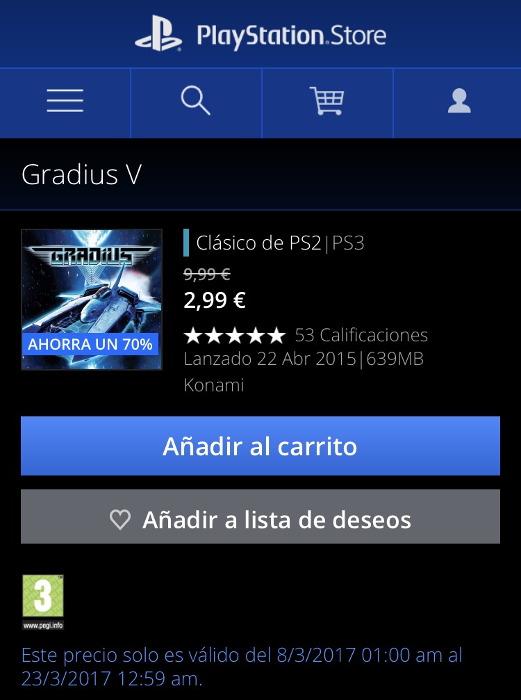 La versión digital de Gradius V compatible con PS3 (ya les vale no currársela con PS4) a precio de juego de móvil malo. Solo que este shoot ‘em up es como mínimo uno de los mejores de la historia, el último del género que se desarrolló bajo el sello de Treasure con Hiroshi Iuchi al mando, y uno de los horizontales más brutales que podrás jugar nunca.